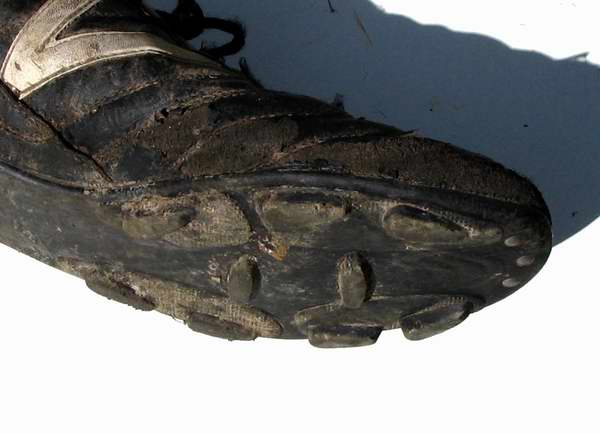 Klingt also ganz so, als ob die Schuhe kaum als Laufschuhe geeignet wären. Doch halt! Sie sind lediglich NICHT für OL-Wettkämpfe, wohl aber für ein lockeres Querlauftraining geeignet, denn viele der vermeintlichen Nachteile erweisen sich als Vorteile: Wenn man sich ständig vor Augen führt, was die Schwächen der Schuhe sind, dann wird man beim Querlauftraining besonders vorsichtig sein und die Füße nicht einfach "irgendwo unachtsam" auf dem Boden aufsetzen. Sprich: Das Tempo wird ganz automatisch niedrig gehalten (was gut ist für ein Ausdauertraining), die (Fuß-) Koordination wird geschult und durch die nicht vorhandene Dämpfung wird man quasi gezwungen, fernab der Wege zu laufen. Und das ist ja - wir erinnern uns - eine der Vorraussetzungen des Querlauftrainings... Jetzt, nach über einem Jahr, zeigen sich erste Ausfallerscheinungen: An einigen Stellen ist die Oberfläche stark von kleinen Ästen durchbohrt, macht aber nix: Die Schuhe sind so billig hergestellt, unter dem Pseudo-Leder-Material ist eine harte, undurchdringbare Plastikschale verarbeitet worden... Fazit: Als Trainingsschuh für lange, lockere Querlaufeinheiten taugen die billigen Treter vollkommen. Schnelles, ambitioniertes Laufen im Wald hingegen ist eher gefährlich, vom Laufen auf Wegen ganz zu schweigen. Also: Immer schön auf die Füße aufpassen! Nachtrag am 10.10.: Zwar sind die Schuhe nicht wirklich geeignet, um darin ambitioniert laufen zu können, aber für einen vorsichtigen 5.5'er Schnitt bei dem Lauf zur Clubmeisterschaft hat es dennoch gereicht... |